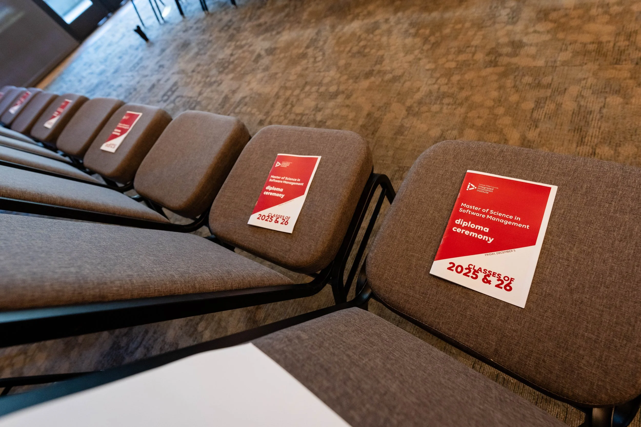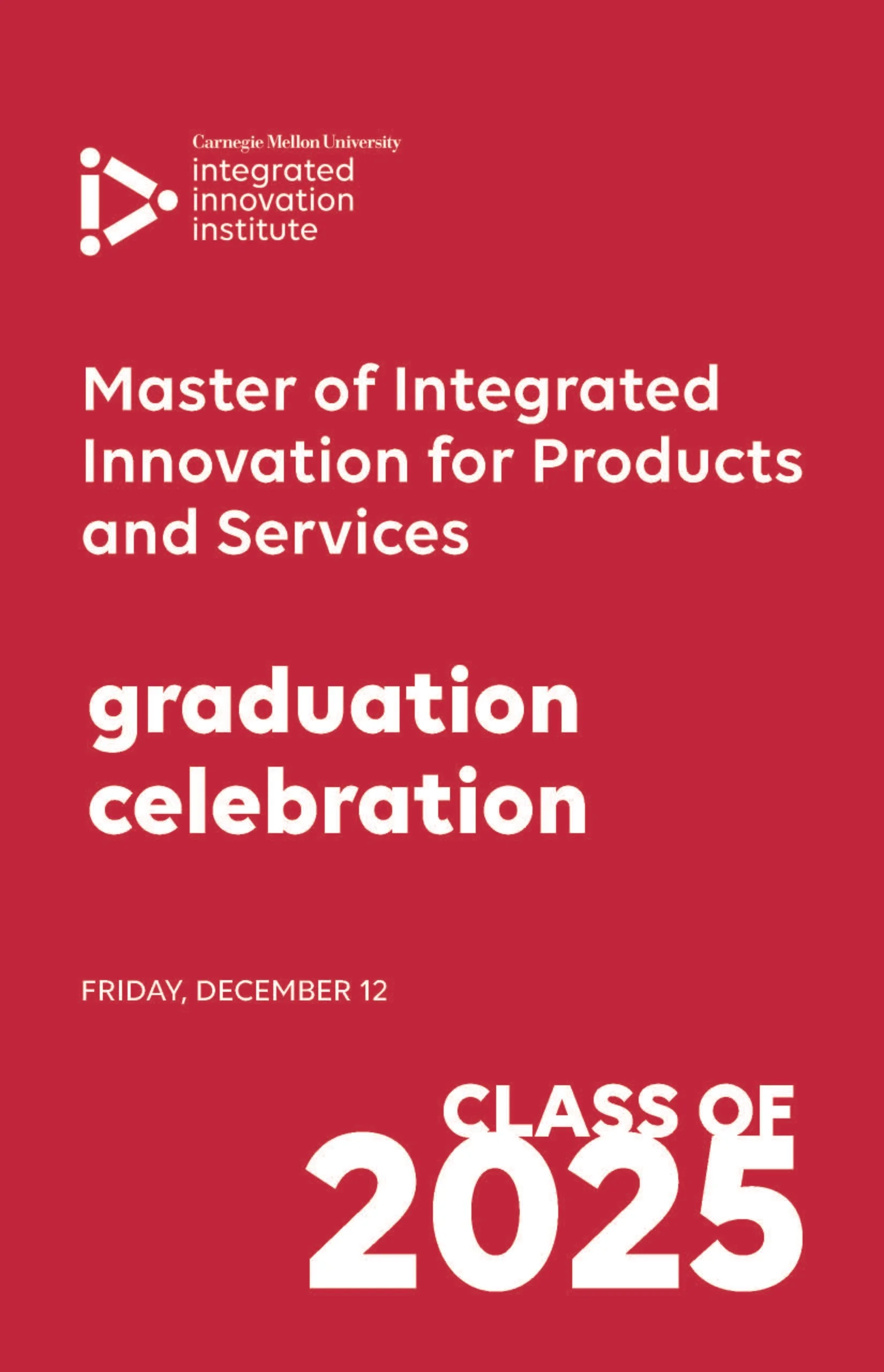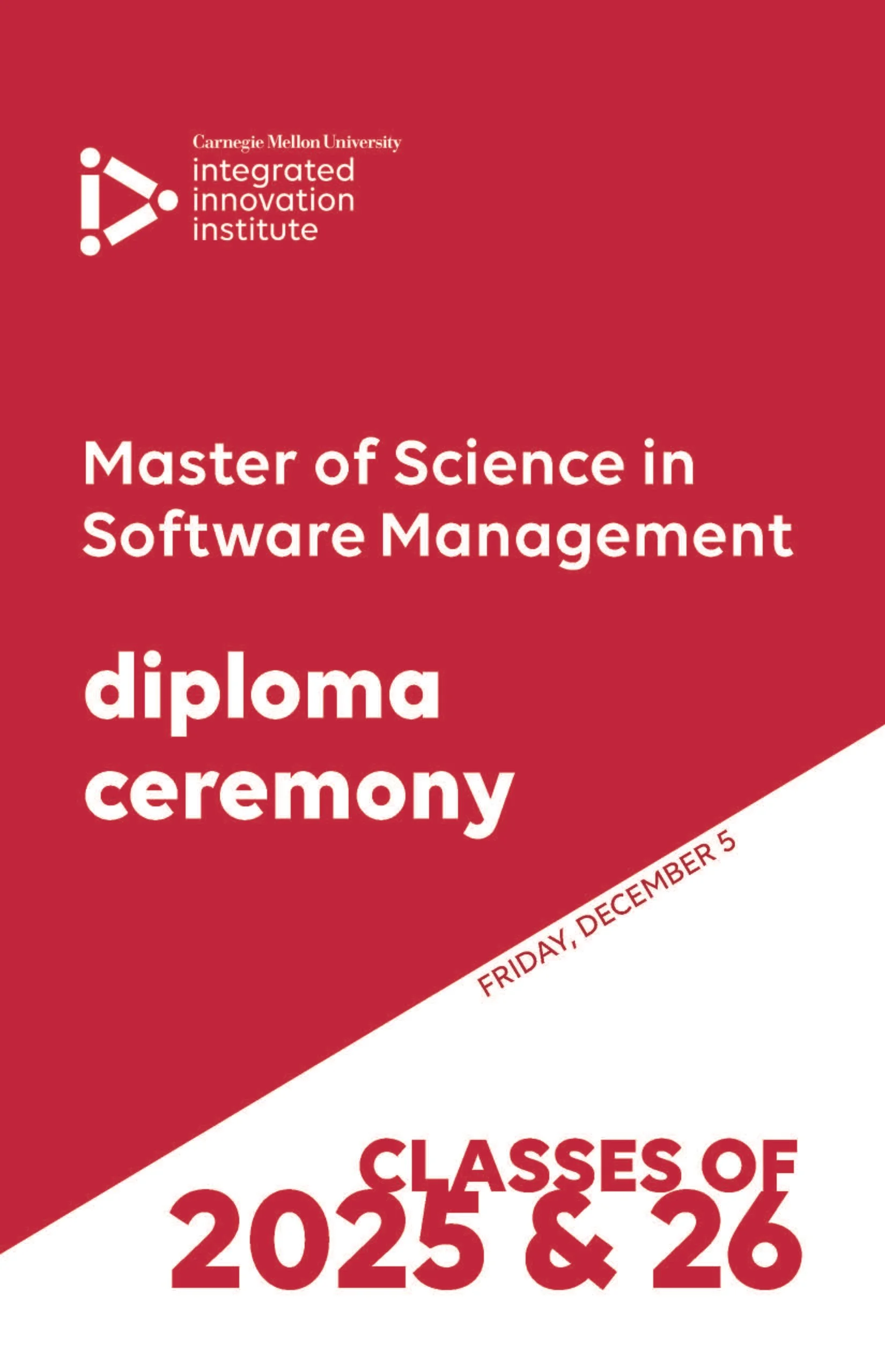 I designed the programs, slide show, and MOSAIC photos for the December 2025 graduation celebration for the students of the Master of Integrated Innovation for Products and Services (MIIPS) program located in Pittsburgh, PA, and the diploma ceremony for the students in the Master of Science for Software Management (MSSM) program located in Silicon Valley, CA.