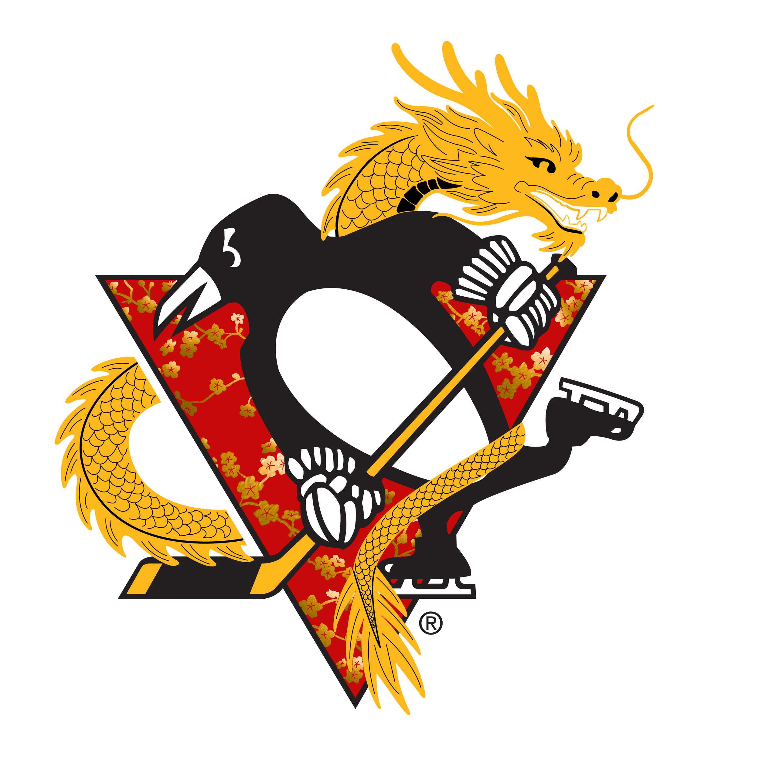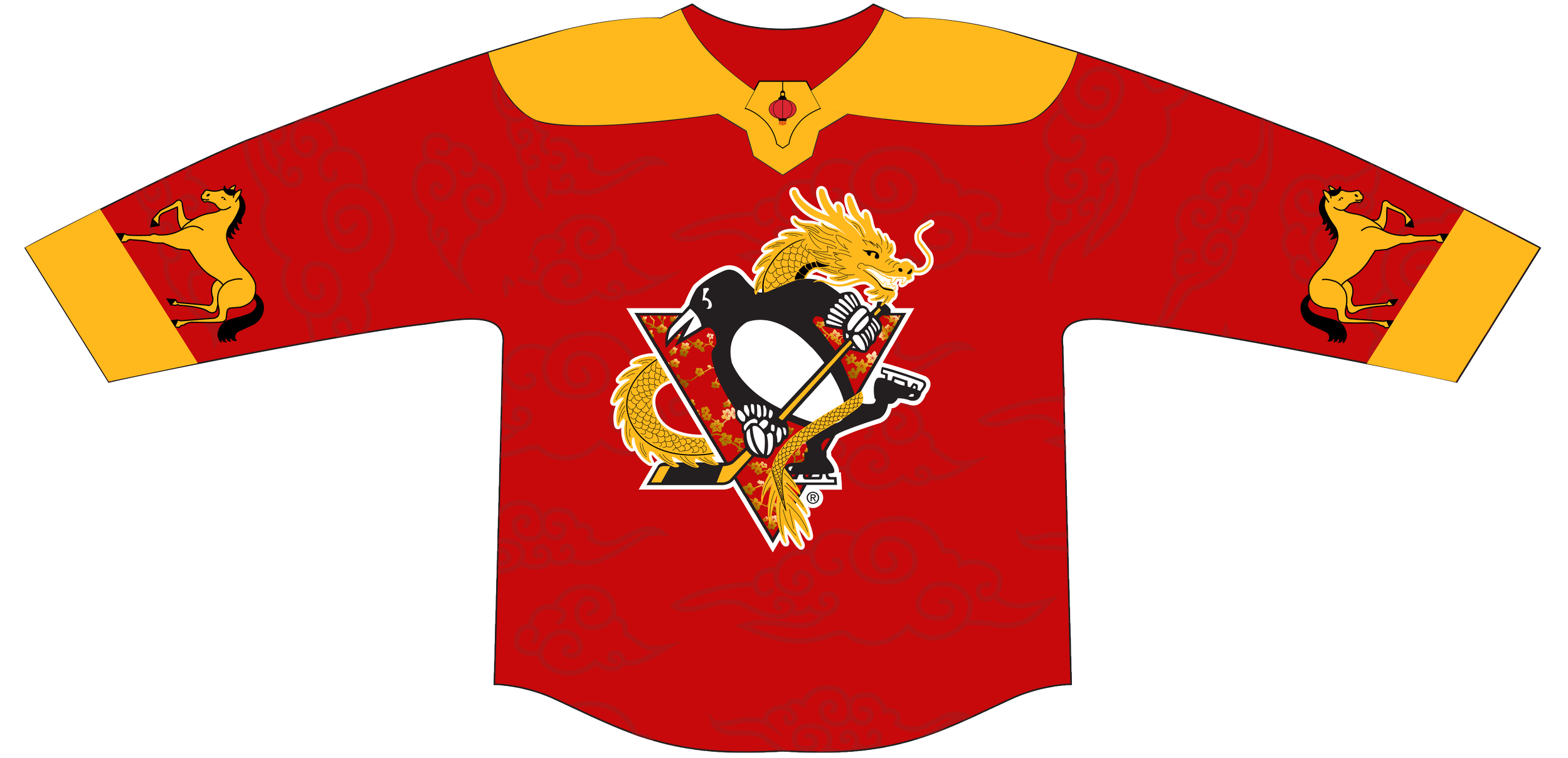 I was inspired by the Chinese holiday (Chinese New Year) for this design, as it is the Year of the Horse, which is my zodiac sign. The horse is the 7th animal in the rotation of the zodiacs, following the snake. If you are the year of the horse, it can mean that you are confident, responsible, and intelligent. The clouds were traditionally stylized from the Shang and Zhou dynasties and are known in Chinese art, clothing, and architecture. For the logo design, in Chinese culture, the dragon is a sign of good luck and represents strength, protection, and brings good fortune. The flowers behind the penguin are called Plum Blossoms and are commonly seen on Asian clothing. The colors I chose were red, gold, and black. The red color symbolizes luck, happiness, and is widely used for many celebrations, and is also the national color of China. Gold symbolizes wealth and good fortune. Black represents power, stability, and wisdom. Black and gold are also the main colors that identify the Pittsburgh Penguins.